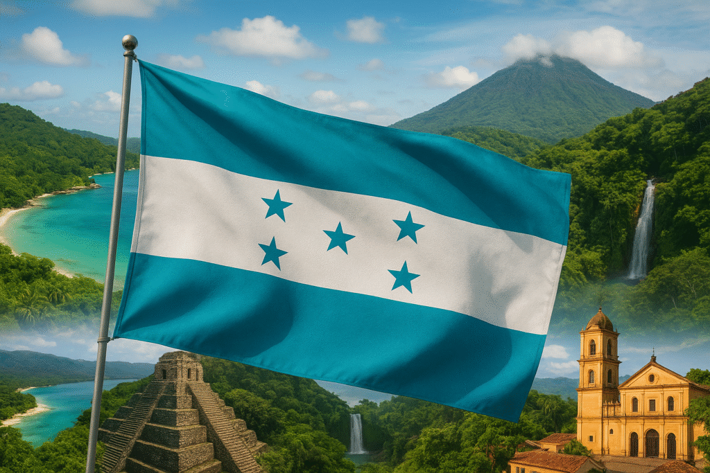 Imagen creada con IA | Representando la Bandera Nacional, de fondo diversos destinos turísticos de Honduras | MRN